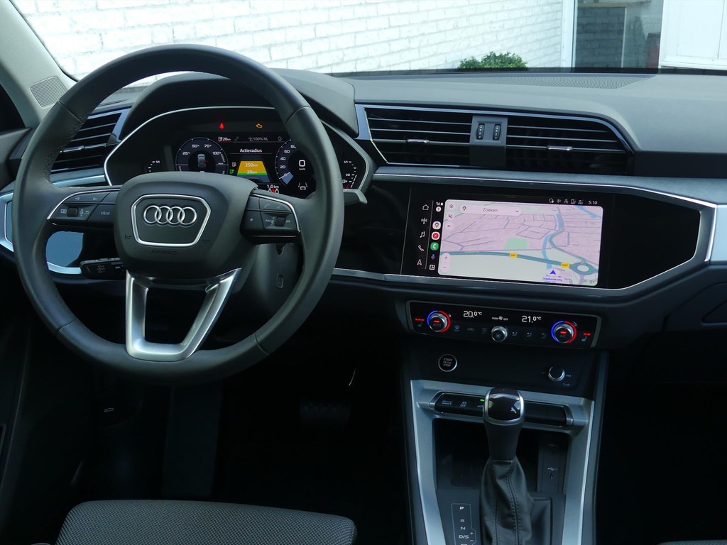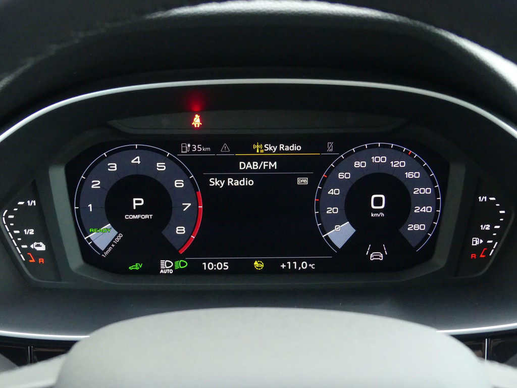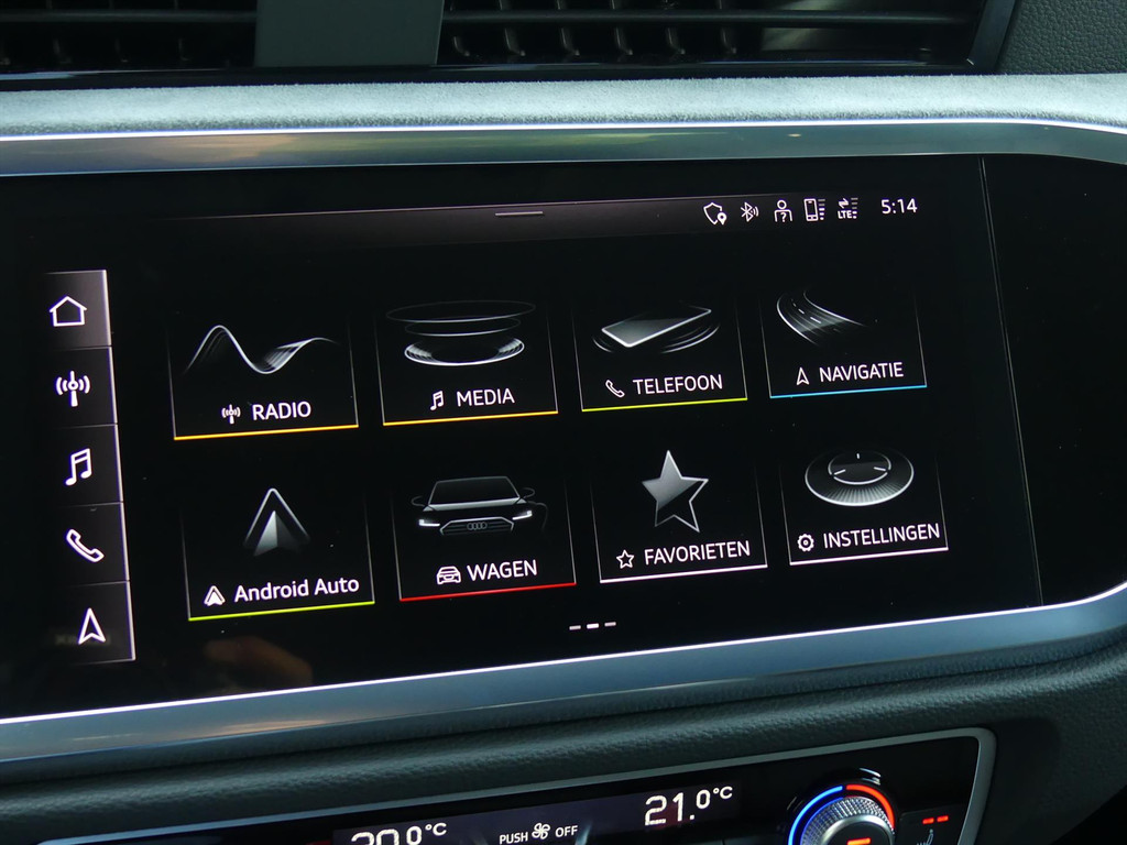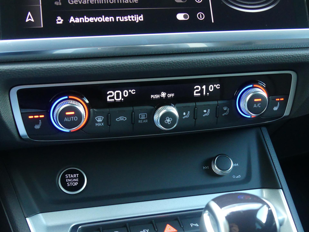 Het digitale dashboard (Audi Virtual Cockpit) ondersteunt u voortdurend met actuele, bruikbare informatie. Adaptive cruise control is veilig en comfortabel. De snelheidsregelaar houdt automatisch afstand tot het voertuig dat voor u rijdt. De bediening van het audiosysteem gebeurt met knoppen op het multifunctioneel lederen stuur. De audio is overigens voorzien van DAB-radio voor een altijd heldere ontvangst. Deze Audi Q3 is een complete auto anno nu, en dat merk je. Bijvoorbeeld door de aanwezige draadloze oplaadmogelijkheid voor telefoons. Met de climate control selecteert u de gewenste temperatuur. Het systeem doet de rest. Met parkeersensoren vóór en achter, regensensor, keyless entry met start/stop knop, buitentemperatuurmeter, automatisch dimmende binnenspiegel en centrale deurvergrendeling met afstandsbediening is deze Audi helemaal compleet.