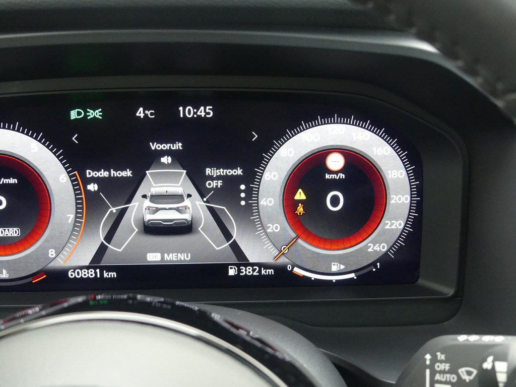 Tijdens de rit wordt u als bestuurder ondersteund door verschillende systemen die de weg en uw omgeving in de gaten houden. Belangrijke ritfuncties permanent in uw zichtveld: dat is het voordeel van de head-up display. De actuele snelheidslimiet, een inhaalverbod en andere verkeersborden. De verkeersborddetectie ondersteunt u tijdens elke rit. Even niet geconcentreerd of afgeleid? Dan zorgt de lane assist dat u in het juiste spoor blijft. In deze Nissan vinden we verder een front assist en bandenspanningcontrolesysteem.